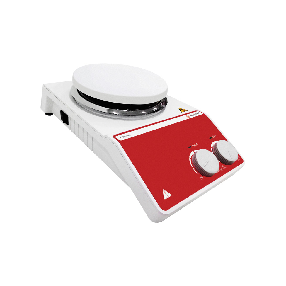 Mieszadło magnetyczne z płytą grzewczą do mieszania cieczy oraz sporządzania roztworów z analogowym pokrętłem regulacji temperatury i prędkości mieszania.