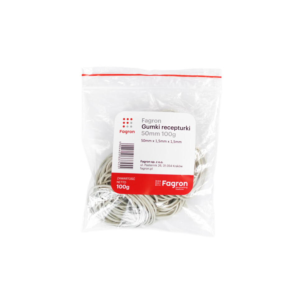 Gumki recepturki FagronLab™ o średnicy 50 mm pakowane w woreczek strunowy.